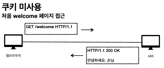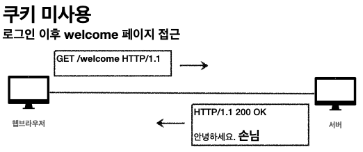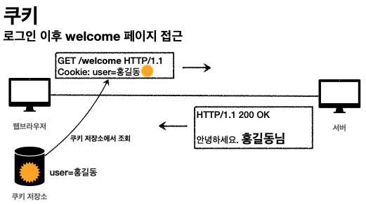 로그인 이후 웹브라우저가 welcome 페이지에 접근하면 자동으로 웹브라우저는 서버에 요청을 보낼 때 마다 쿠키를 꺼내 Cooki: user=홍길동이라는 HTTP 헤더를 만든다.