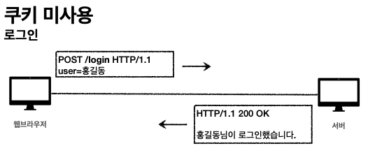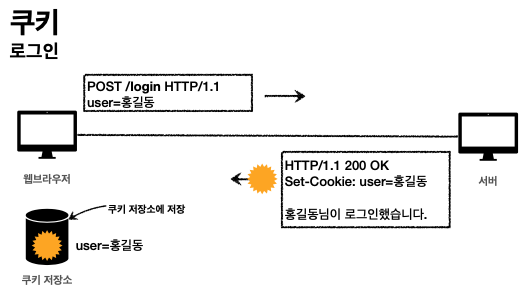 웹브라우저가 로그인 시 서버는 Set-Cookie라고 해서 헤더를 만들어서 응답을 한다. 웹브라우저는 브라우저 쿠키 저장소에 user=홍길동이라는 서버가 보내준 값을 쿠키 저장소에 저장을 해둔다.