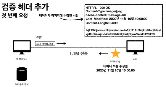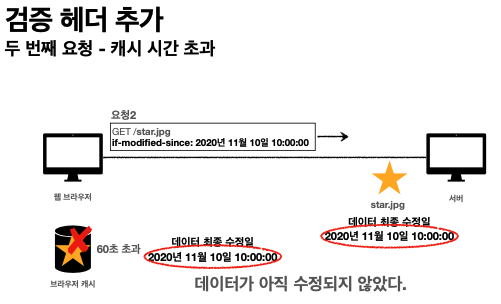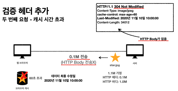 웹브라우저가 60초 초과 후 요청을 보낼때 캐시에 보니깐 last-Modified 있다면 웹브라우저가 if-modified-since라는 HTTP 요청 헤더 날짜를 추가하여 서버에 전송하면 서버에서 요청을 받아 데이터 최종 수정일과 요청한 데이터 수정일을 서버에서 검증할 수 있다.