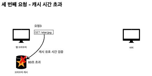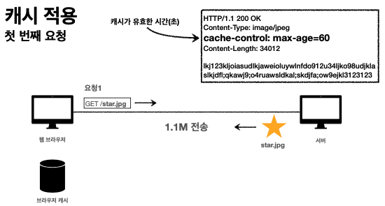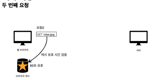 캐시 컨트롤이라는 것을 HTTP 헤더에 넣어줄수있다. 이건 캐시가 유효한 시간을 의미 한다. 60초동안 캐시가 유효하다. 최초로 요청을 할때는 strt.jpg가 내려가면 60초 유효하다고 적어놓고 응답결과를 캐시에 저장하고 두번째 요청 때는 캐시를 먼저 확인하고 캐시가 유효하다면 캐시에서 가져온다(네트워크를 타지않음)