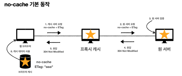 - no-cahce : 데이터는 캐시해도 되지만, 항상 원(origin)서버에 검증하고 사용